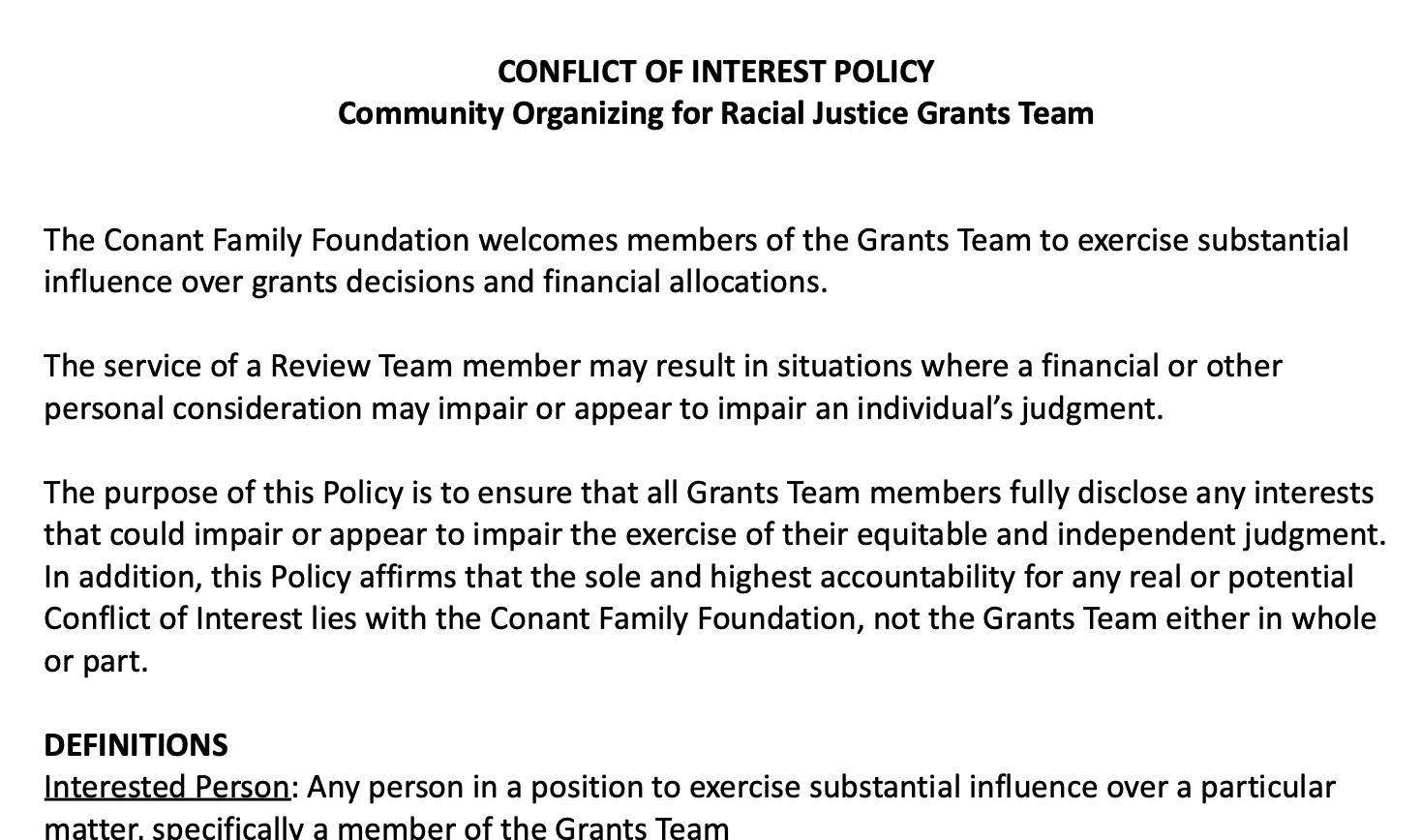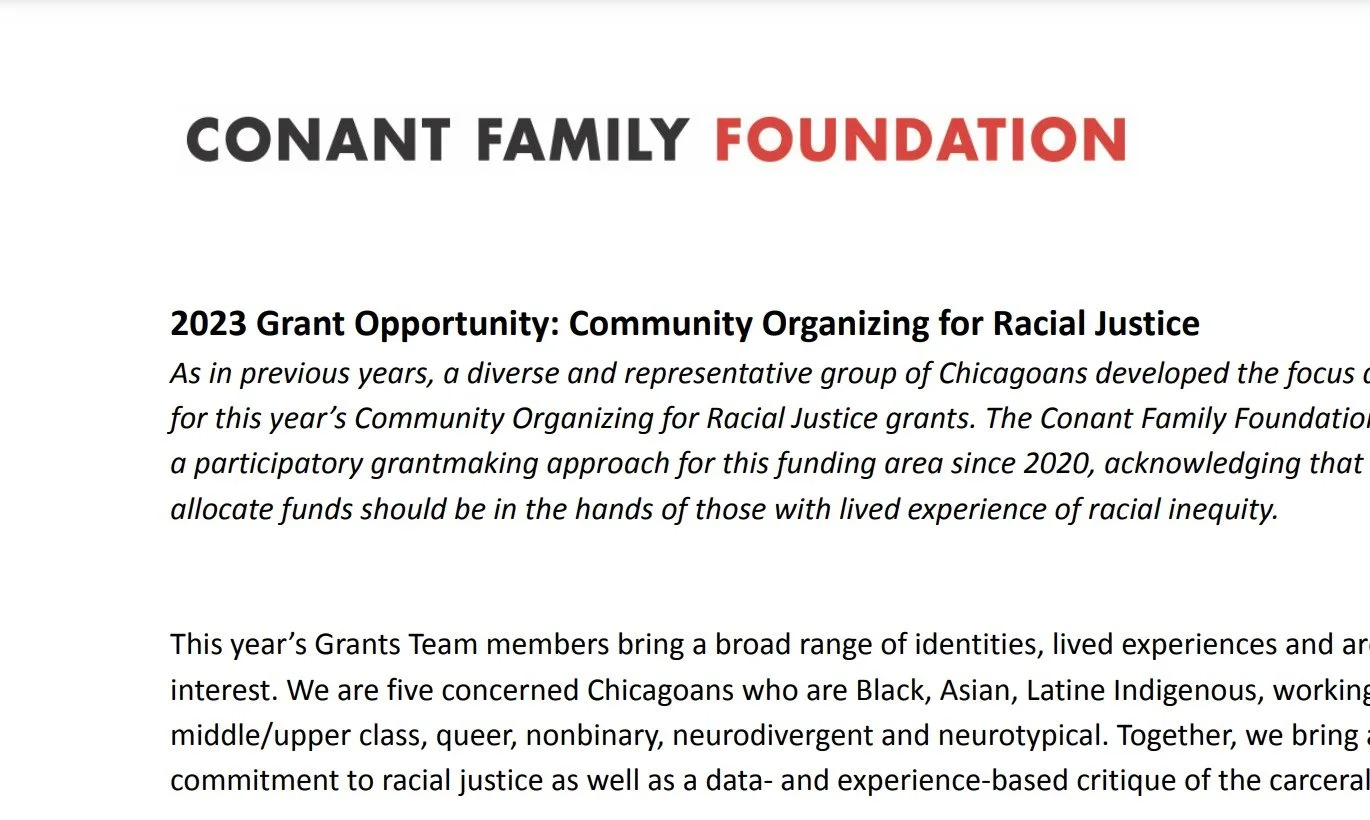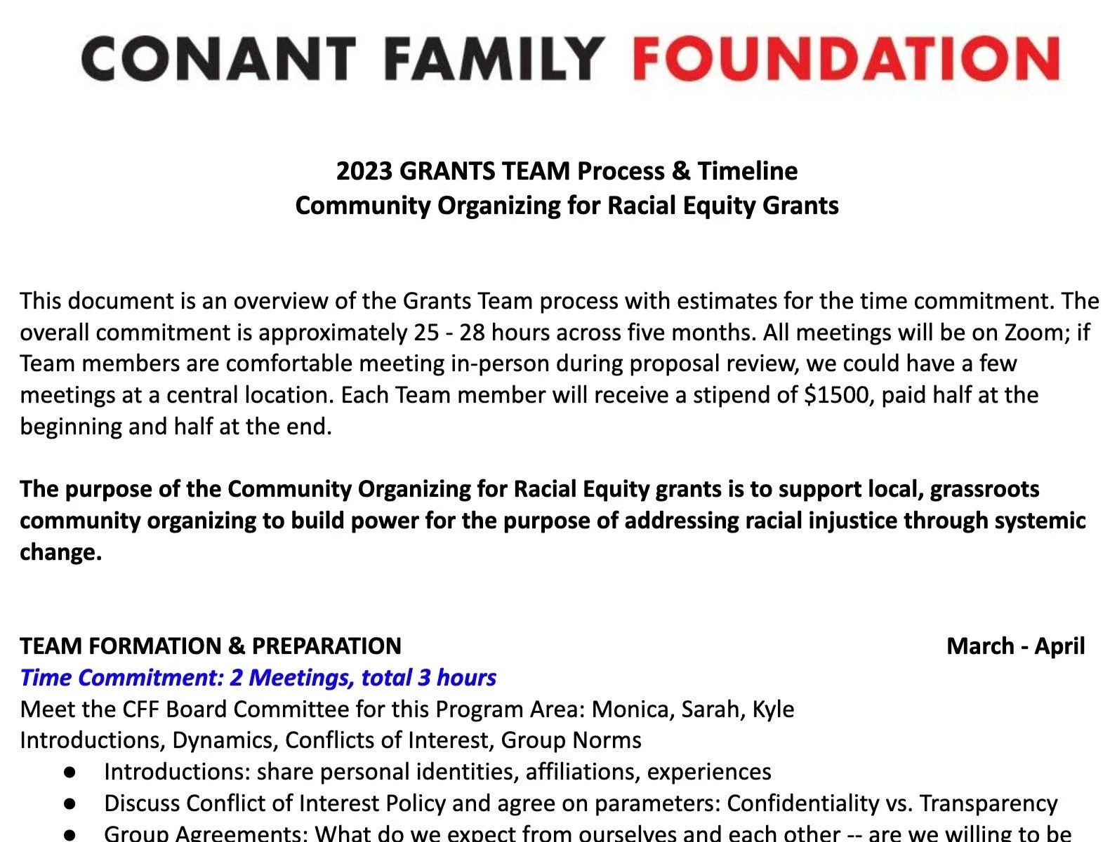 The Conant Family Foundation board determined the program area: Community Organizing for Racial Justice.